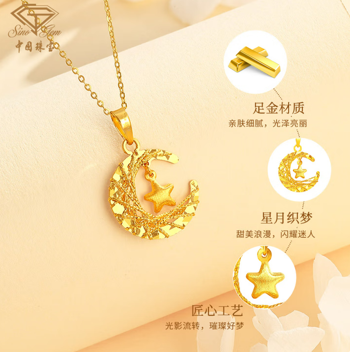 中国珠宝黄金项链足金999吊坠黄金织梦网星月套链送老婆生日礼物送女友吊坠赠银链【玫瑰礼盒】