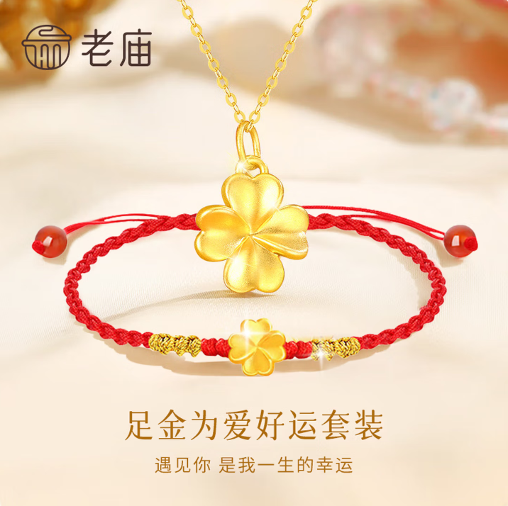 老庙黄金吊坠足金四叶草项链挂坠女锁骨链首饰送女友老婆跨年新年礼物 四叶草吊坠+手链约0.73g+礼盒